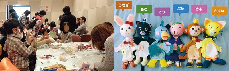 講師2名で行う、人形づくりワークショップ。人形づくりキットを使って子どもたちといっしょに人形を作り、最後に簡単なお話で人形操作をします。