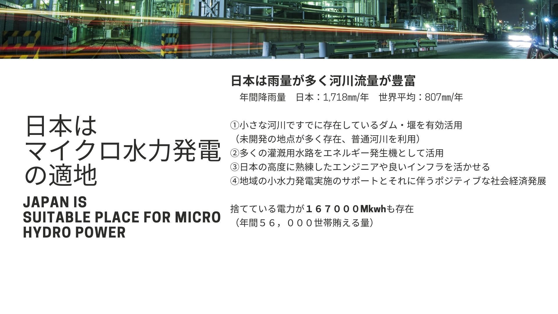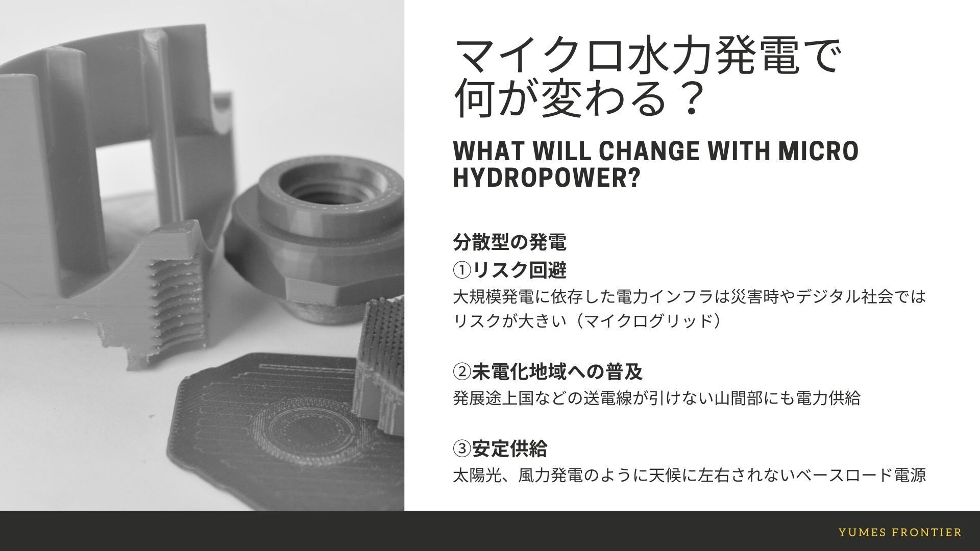 マイクロ水力発電が普及すれば、リスクを回避するためにも 大規模発電に頼らない分散型のマイクロ発電が実現できると考えています。