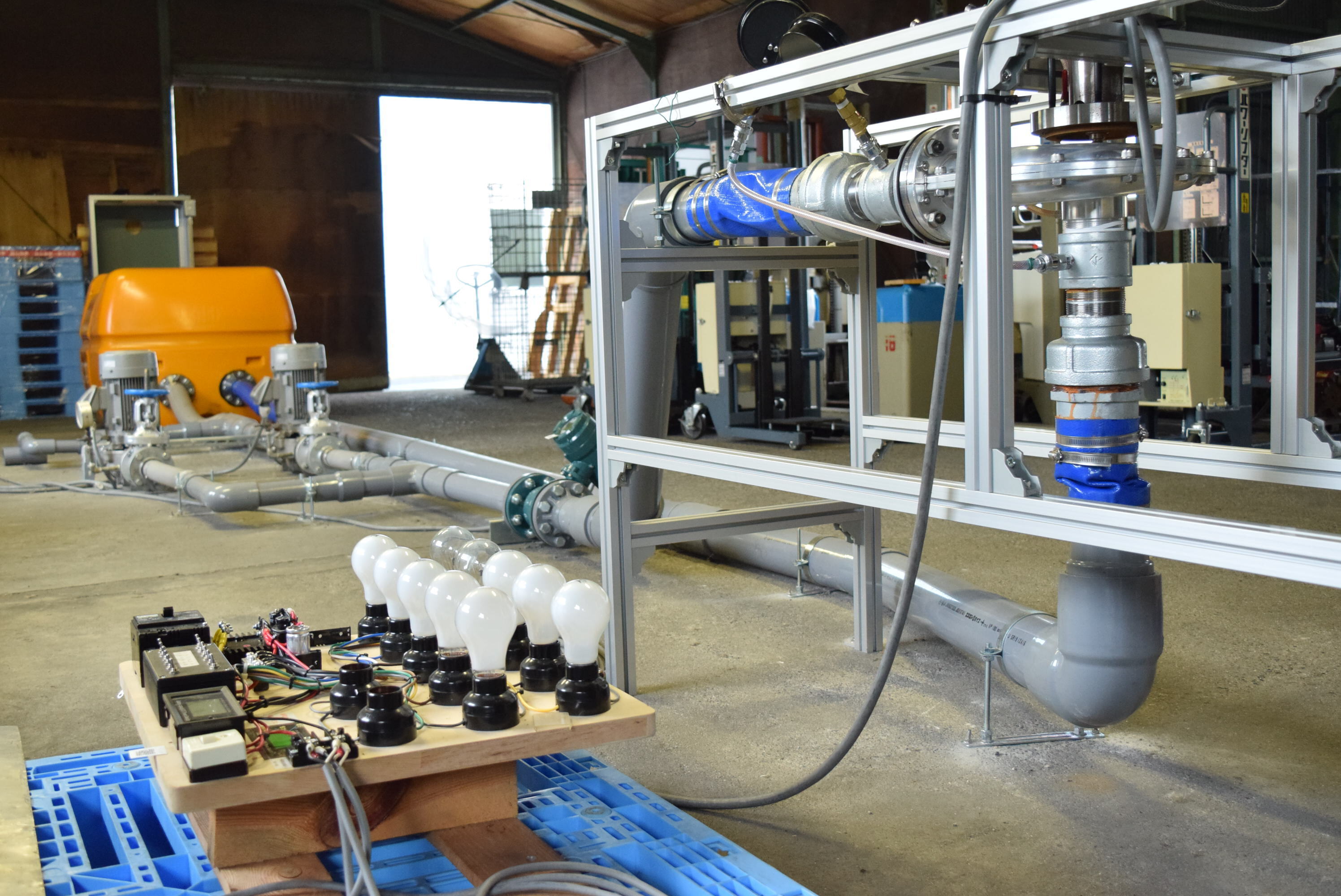 2020/10/09 19:00(株)ユームズ・フロンティアの林です。クラウドファンディングも残り2日となりました。ご支援いただいた方に心から感謝しております。今回は社内の実験場を紹介させていただきます。写真は社内で性能試験をする設備となります。弊社は三重県鈴鹿市で活動しており、4500㎡ほどの敷地に工場が3棟建っております。そのうち1棟をマイクロ水力発電の性能試験用に使用しております。流量を5~30L/s流すポンプが2台あり、設置場所を想定していろいろな条件で水車に水を流しております。それらから発電した電気は再度ポンプの電気に利用するか、最近ですと少し冷え込んできましたので電気ストーブなどに使用したりしています。写真に写っている豆電球は発電すると実際に点灯します。発電していることを可視化するために設置しております。リターンでは実際に実験設備をご案内させていただき、過去のかいはつの経緯についても簡単にご説明させていただきます。ぜひご支援いただけると嬉しいです。 もっと見る実験用の発電機、パワコンが到着!