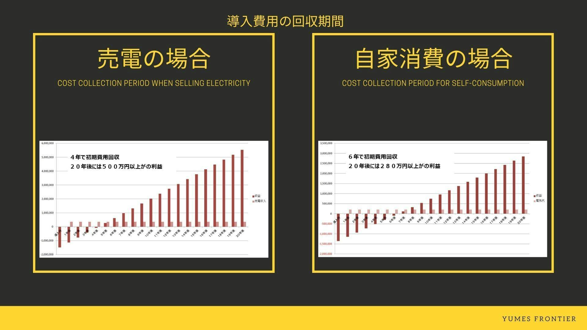 売電した場合では4年程、自家消費した場合では6年程で初期費用が回収できると考えています。