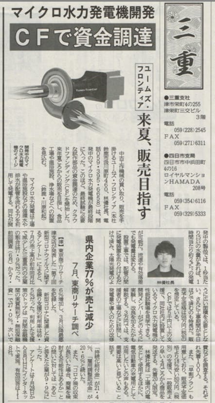 2020年9月9日、中部経済新聞に弊社マイクロ水力発電が掲載されました。