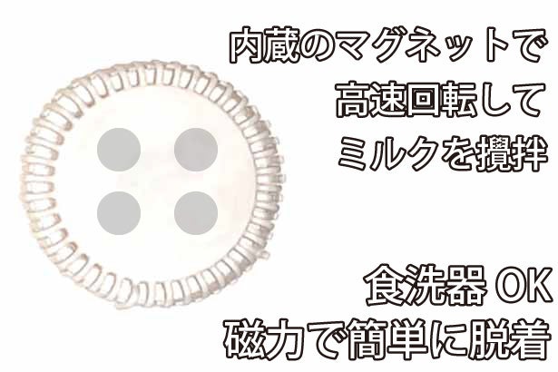 MCJOYの泡だて器は、4つのマグネットを内蔵して、高速回転する事でミルクを攪拌してふわふわなミルクを作ります。脱着も簡単でマグネットの力で取り外しが可能です。使用後は食洗器にそのまま入れて簡単に洗浄できるので毎日の珈琲がもっと気軽に、楽しくなります。(※製品画像は改良により今後変更する場合があります)