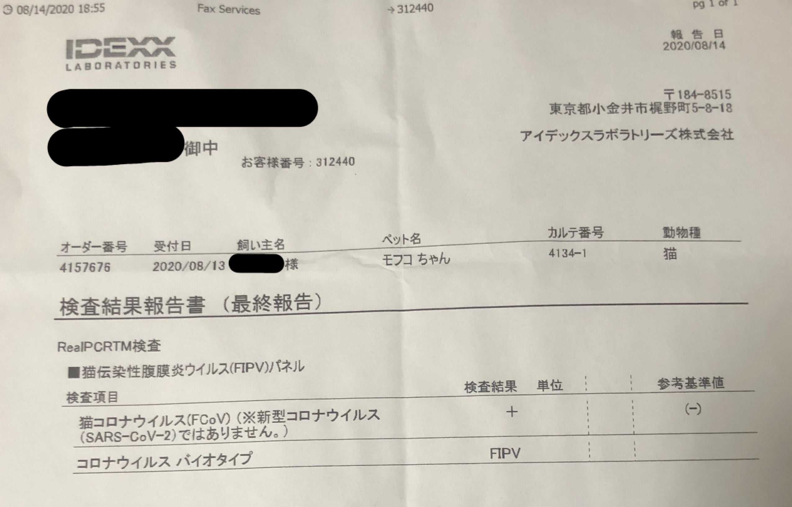 8月16日 検査機関で❮FIP確定❯と診断されました。