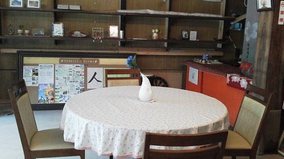奥に映っているのが、看板をリサイクルして作った掲示板で、近隣の観光マップや夏休みのイベントチラシなどを貼っています。