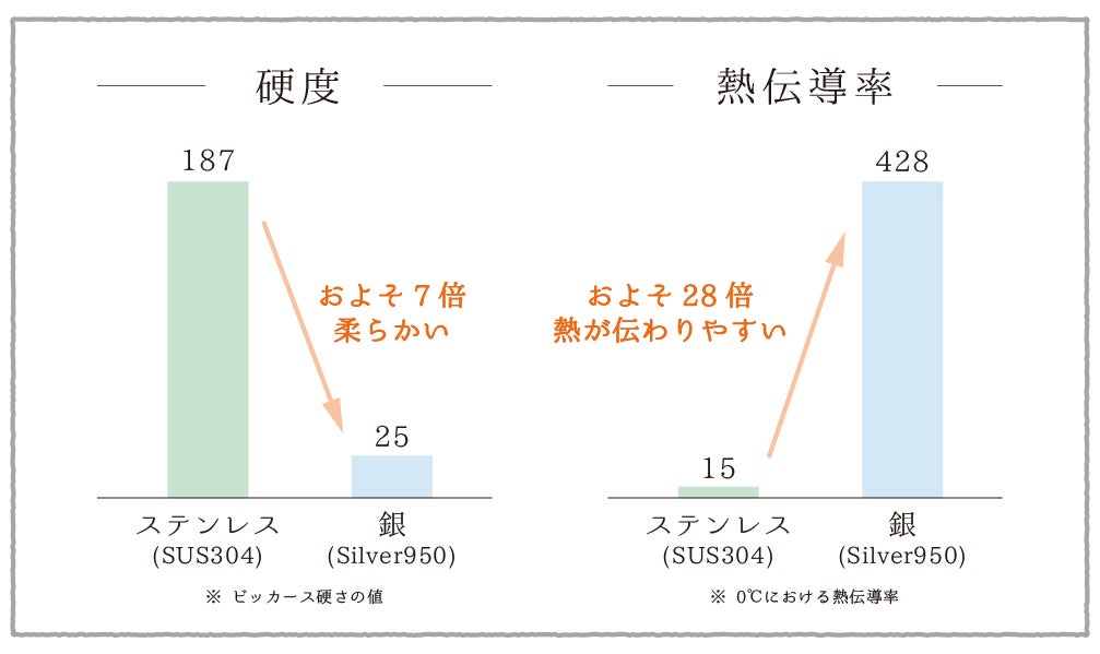 ・銀の硬度は一般的なステンレスの約 1/7。だから口当たりが柔らかい