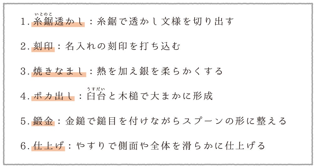 『ふくふく』は伝統的な鍛金技法でうみだされます。製作工程は大別して以下の6つ。全行程が職人の手作業で行われるため、あたたかみのある作品に仕上がります。
