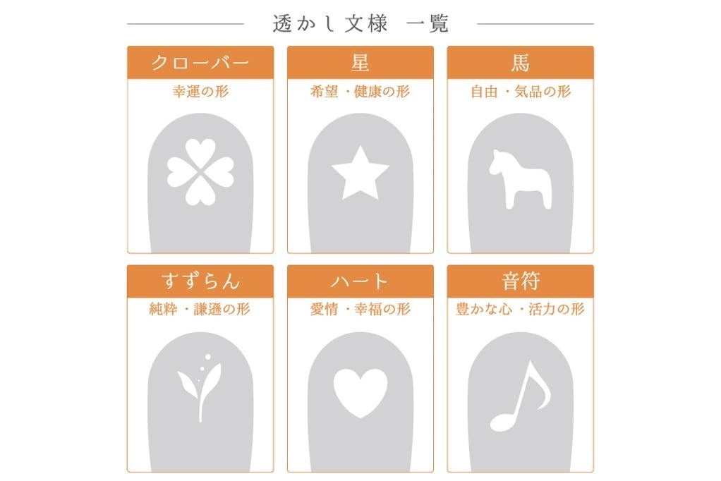 透かし文様は、基本の6種類の絵柄に加え、お好きなデザインをオーダーメイドすることもできます。