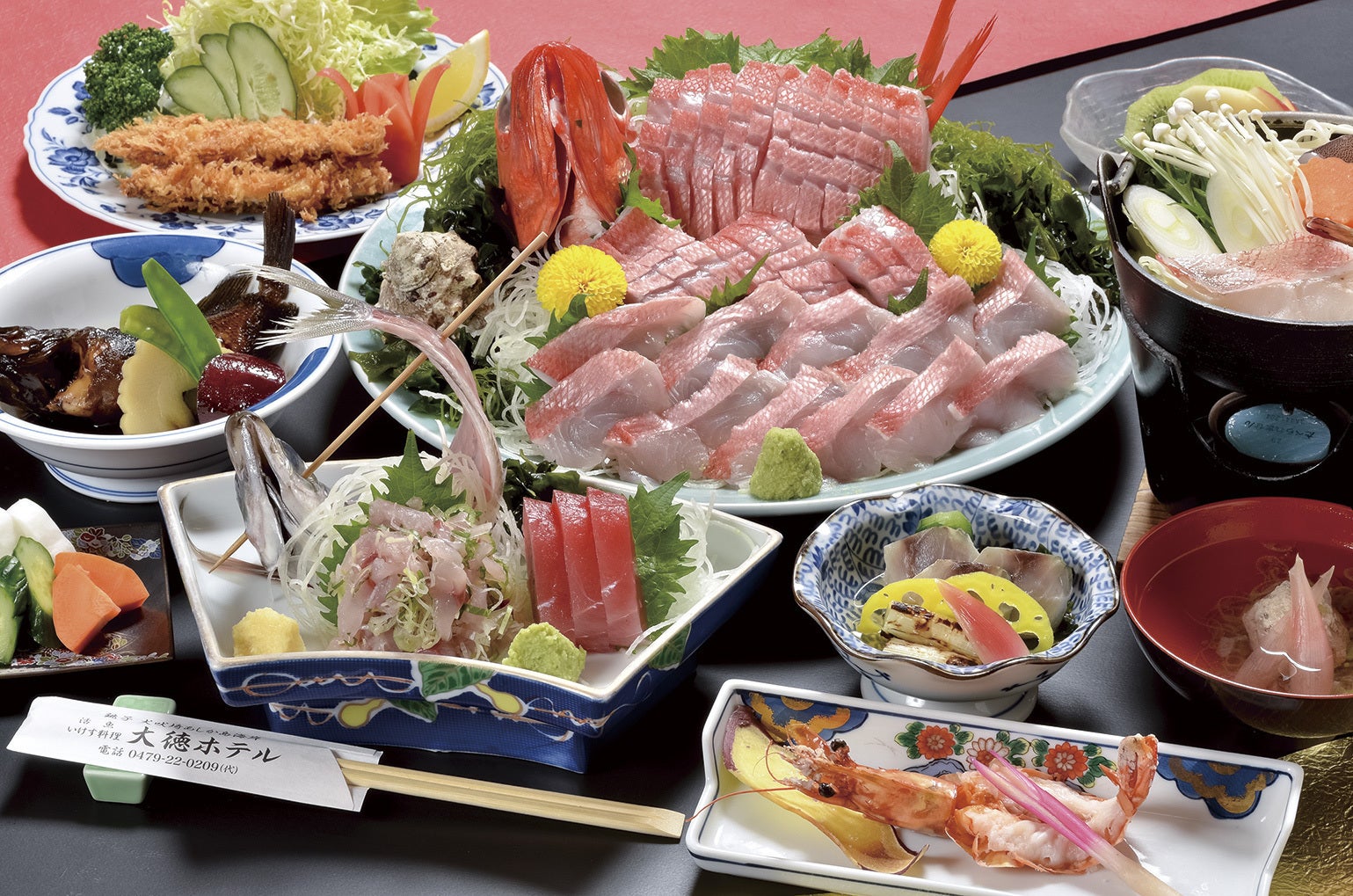 お食事は、季節のお刺身や銚子港から直送の新鮮な魚づくしのお料理です。