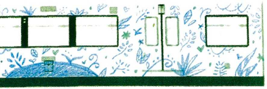 そこで、この原画を本格的にデザインしていただく協力者を探していたところ、大阪モノレールの30周年記念事業のロゴマークをデザインしていただいた吉岡印刷株式会社(奈良県葛城市)が、このプロジェクトにご賛同いただき、原画をもとに手書きの草花を配置し、躍動感あふれる「ブルーエール号」を仕上げていただきました。