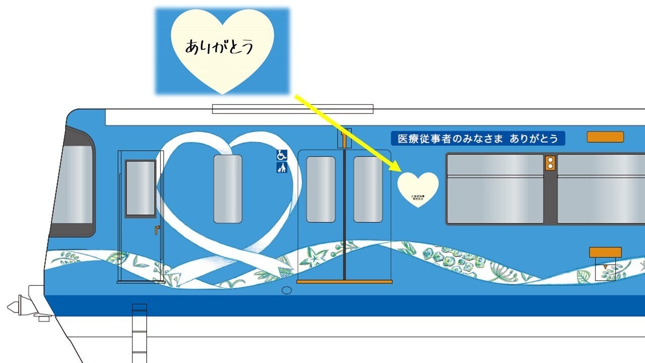 さらに、車両の扉横には、感謝を伝えるハートマークを掲出し、その中に、本プロジェクトへご賛同いただいた大阪府知事と豊中市長、吹田市長、茨木市長、摂津市長、守口市長、門真市長からいただいた「ありがとう」というお言葉を記載する予定です。