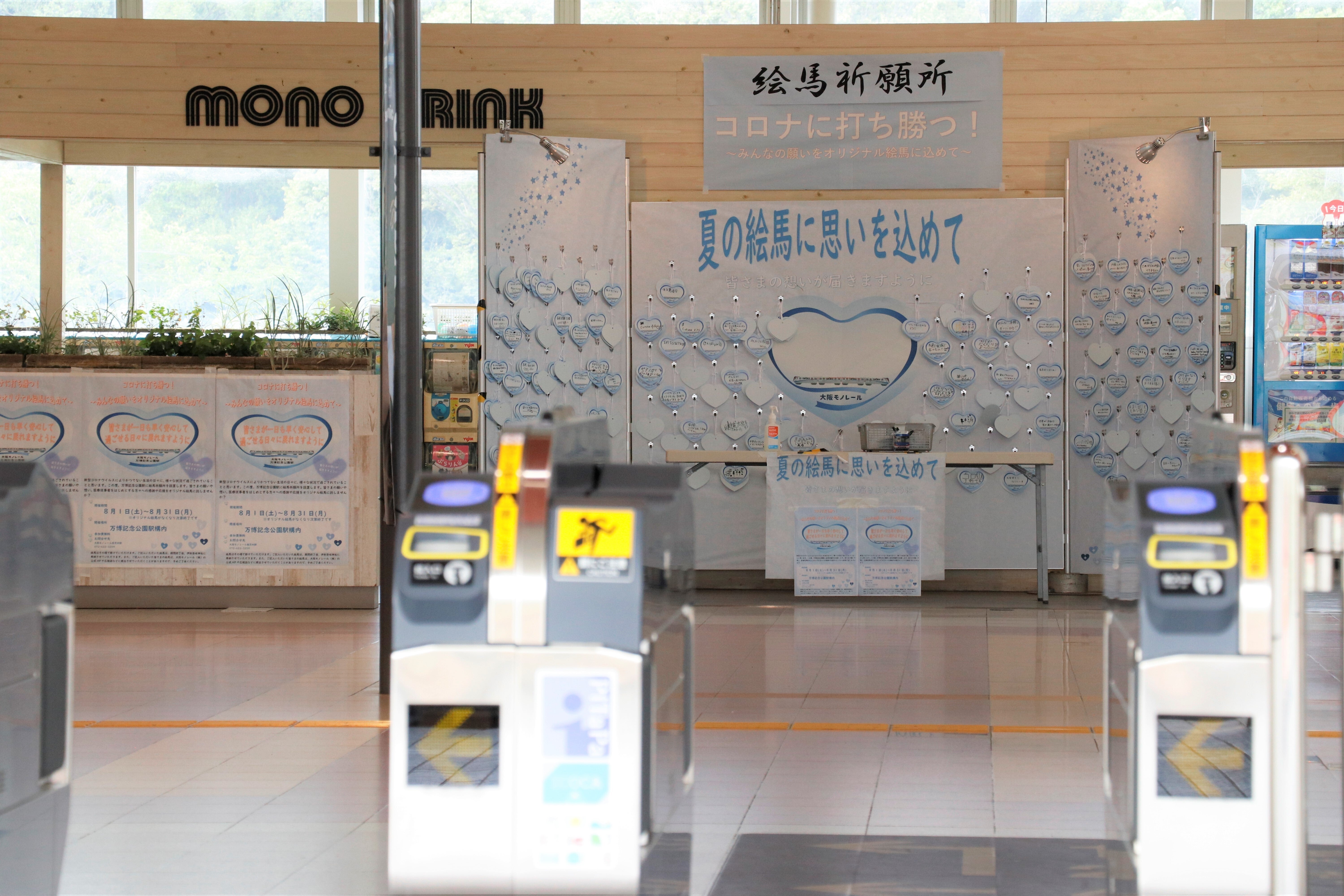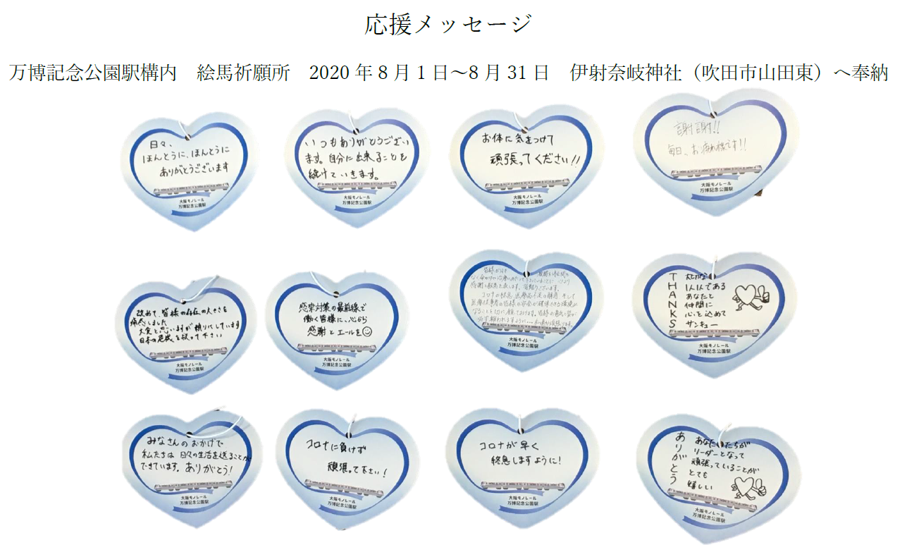 2020年8月1日から31日まで、万博記念公園駅構内で開所いたしました絵馬祈願所において、医療従事者への応援や励ましのメッセージなどが多数寄せられております。