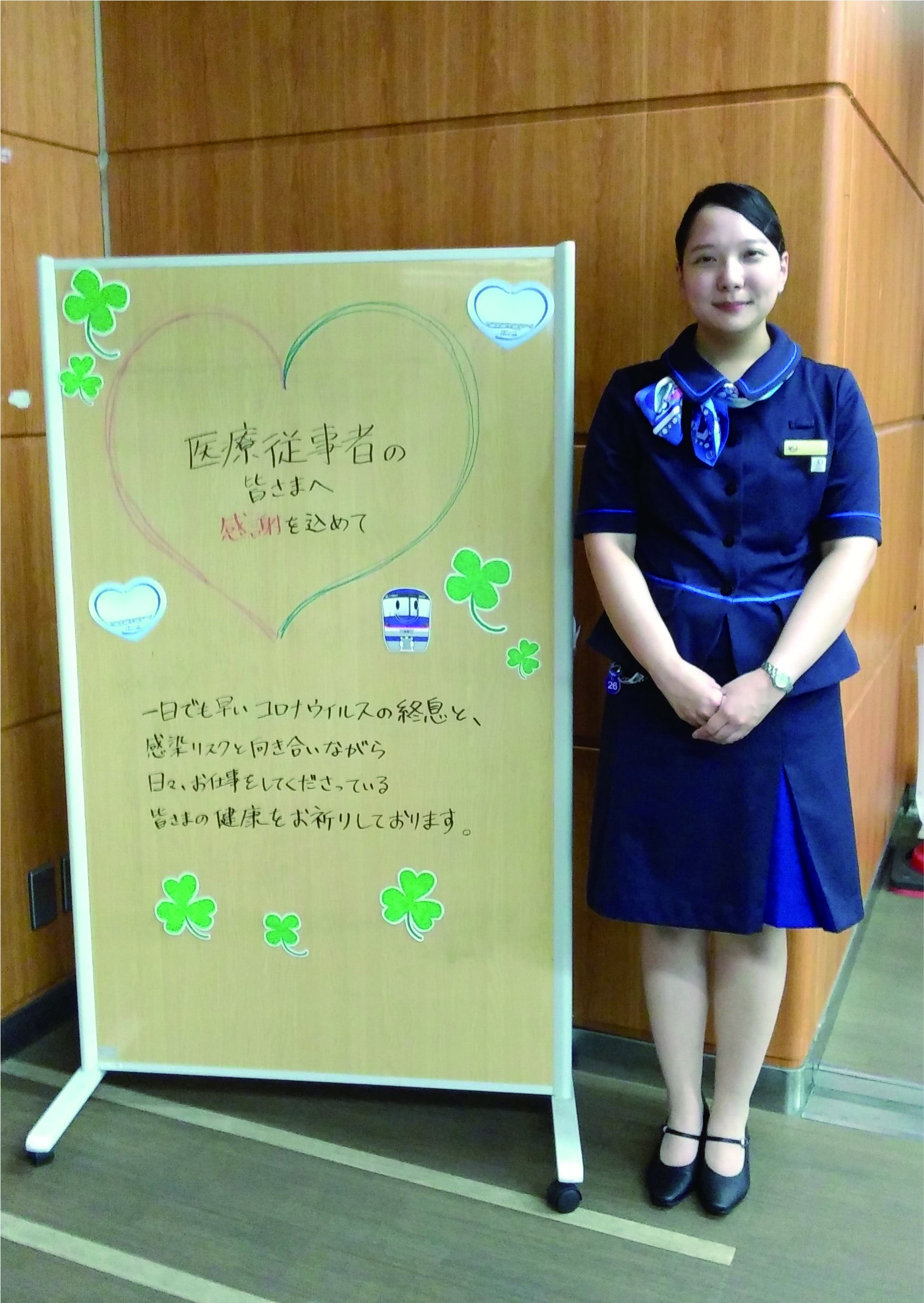 この素晴らしい提案について社内で検討しましたが、車両をラッピングするには相当な費用がかかるため、まずはできることから始めようと考え、第一線で治療に尽力されている医療従事者の方々に対し、駅構内や車内で、感謝や応援メッセージなどを伝えてまいりました。これらの取り組みに対して、お客さまからは、お礼や励まし、共感のお言葉を数多くいただきました。