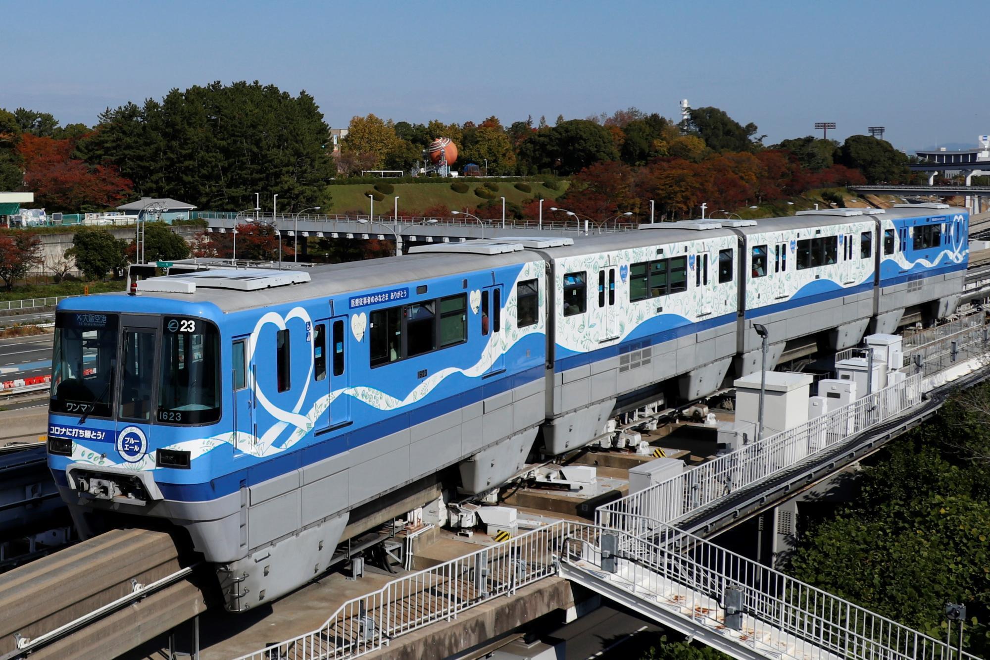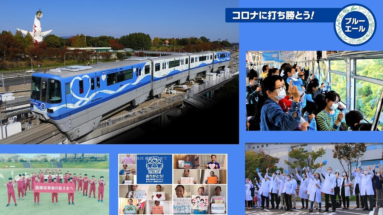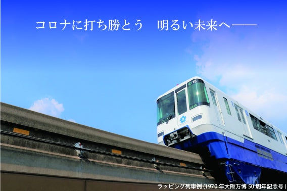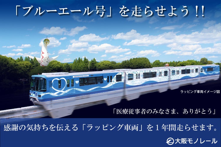 そこで、このお客さまの思いを、医療従事者の方々をはじめ、全国の多くの方々に見ていただきたいという気持ちから、大阪モノレールでは、4月にお客さまからご提案のあった医療従事者の方々に対して、感謝や応援メッセージを大阪モノレールのラッピング車両を通じて伝えるプロジェクトを進めることといたしました。1編成4両の車体をラッピングし、「ブルーエール号」と名付け、2020年11月から2021年10月まで1年間走らせます。