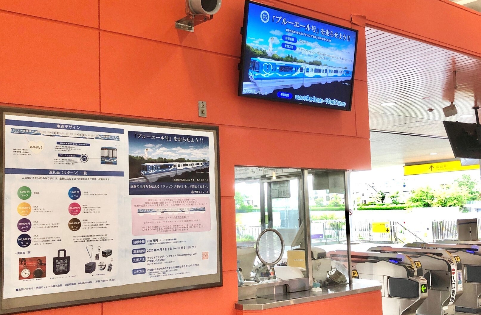 大阪モノレール全18駅構内の駅案内モニターおよび掲示板にて、「ブルーエール号」プロジェクトの情報発信を行っています。(画像は万博記念公園駅)