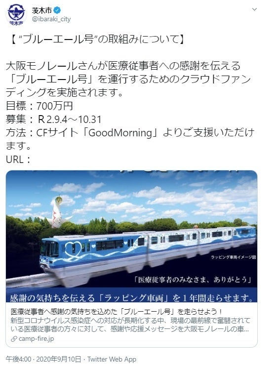 茨木市公式FacebookとTwitterに、「ブルーエール号」プロジェクトの内容を投稿いただきました。目標金額や募集期間などのプロジェクト概要を紹介いただきました。