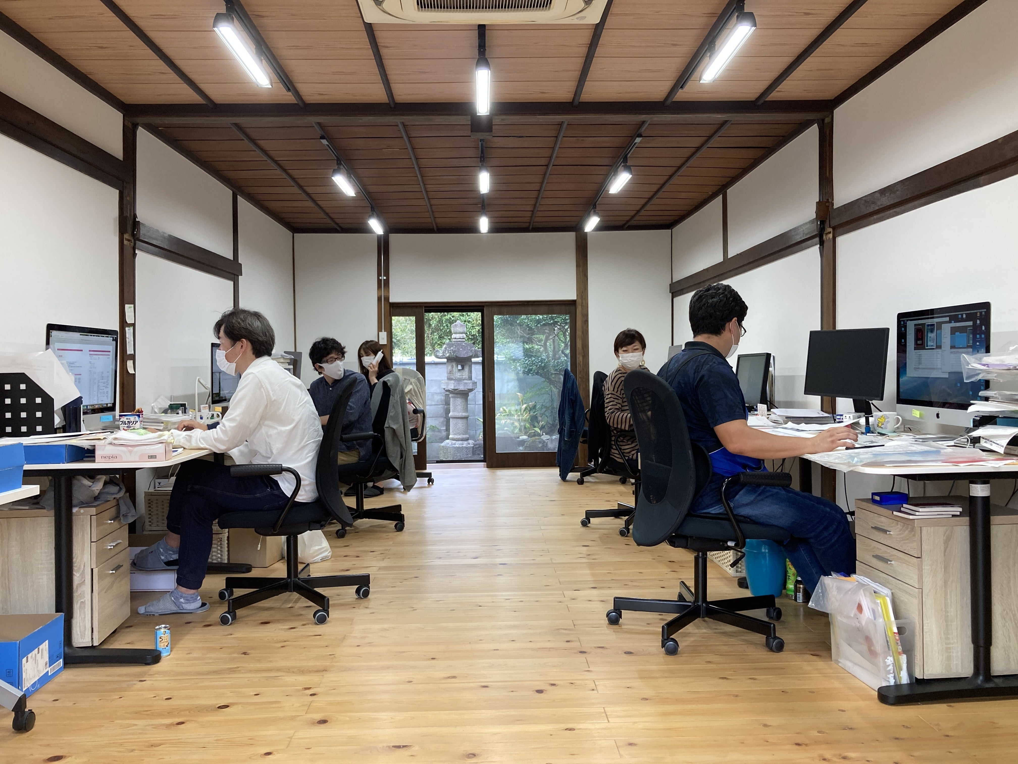 奈良県葛城市にある吉岡印刷株式会社。古民家をリフォームした「古民家デザインオフィス」でクリエイティブな作業をされています。「医療従事者の方々へ感謝の気持ちを伝える」という今回の取組みにご賛同いただき、「ブルーエール号」車両ラッピングのデザインをサポートいただいた会社です。