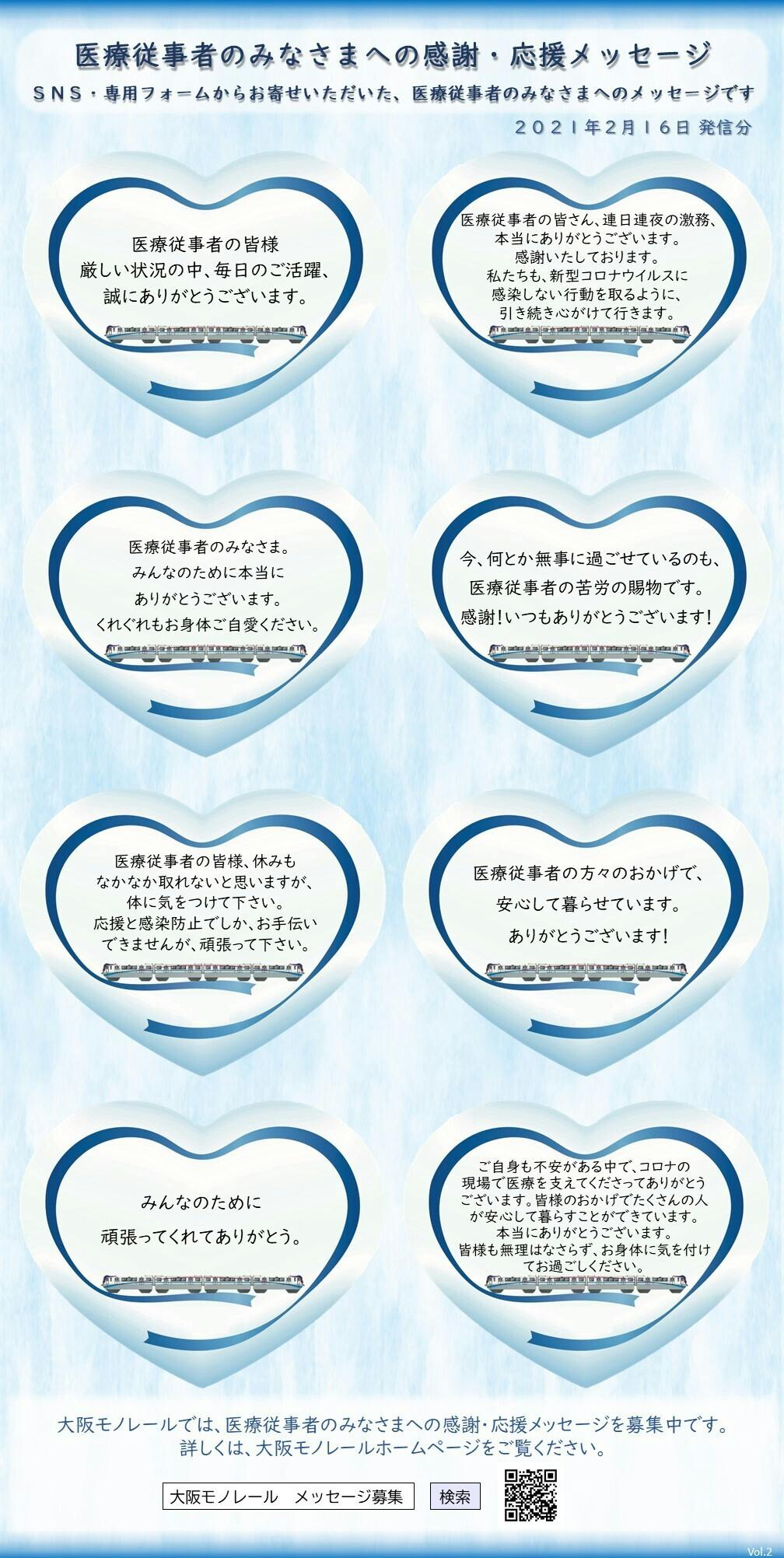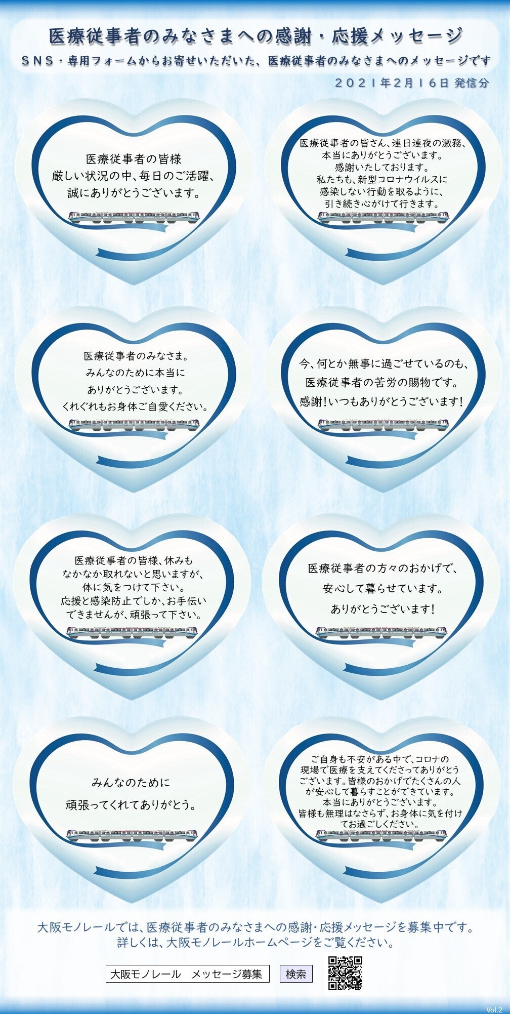 大阪モノレールでは、2020年12月15日から2021年3月21日まで、医療従事者の方々への感謝や応援メッセージを募集しております。今回は、これまでにみなさまからお寄せいただいた感謝・応援メッセージの一部をご紹介します。
