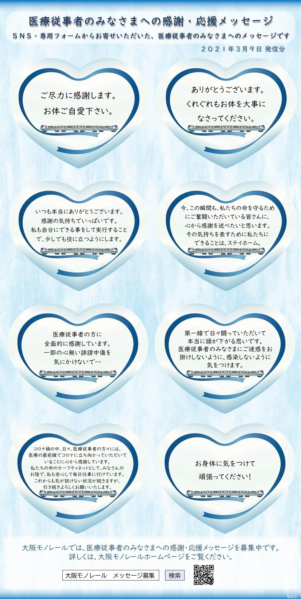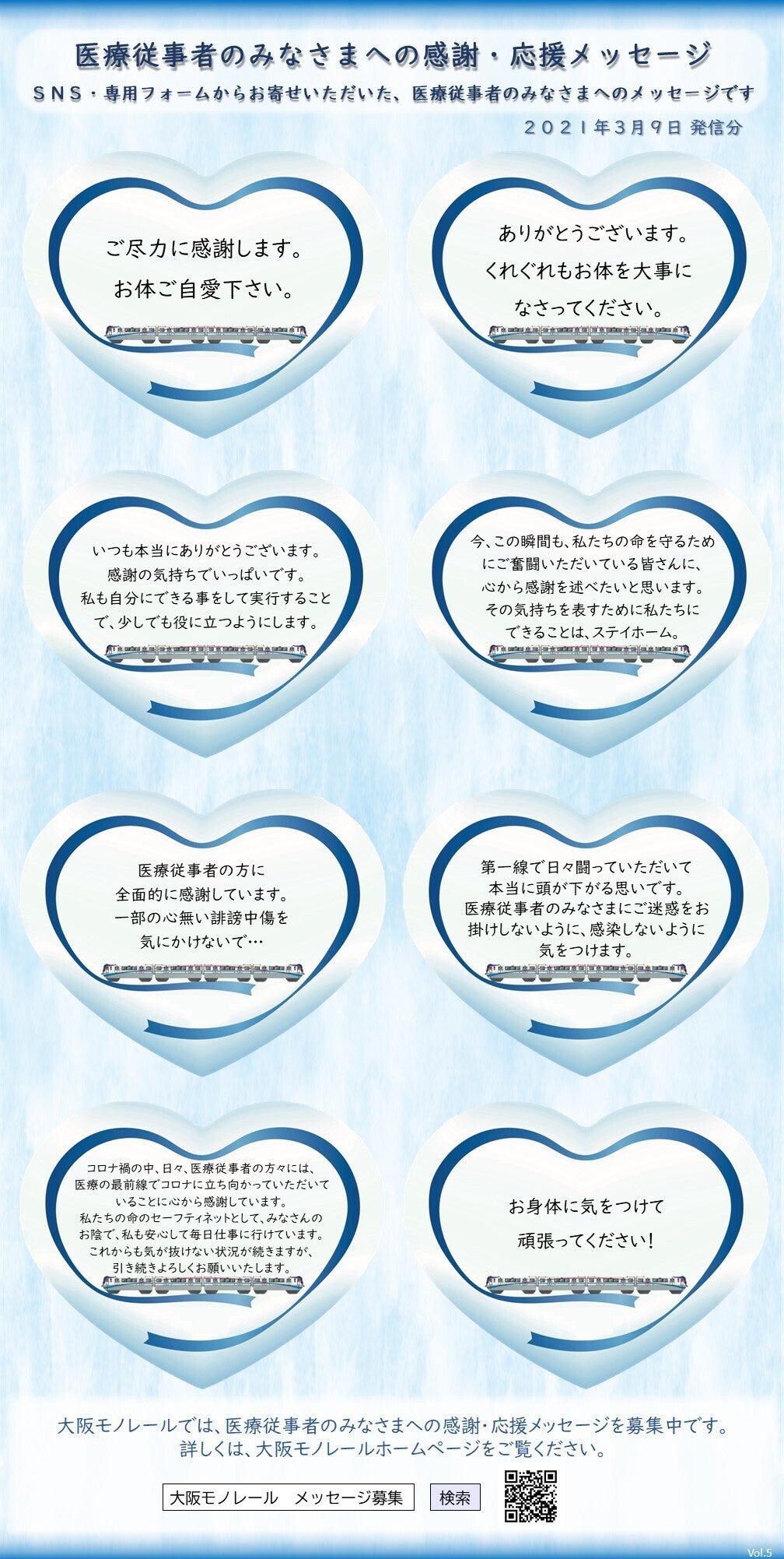 大阪モノレールでは、2020年12月15日から2021年3月21日まで、医療従事者の方々への感謝や応援メッセージを募集しております。今回は、これまでにみなさまからお寄せいただいた感謝・応援メッセージの一部をご紹介します。