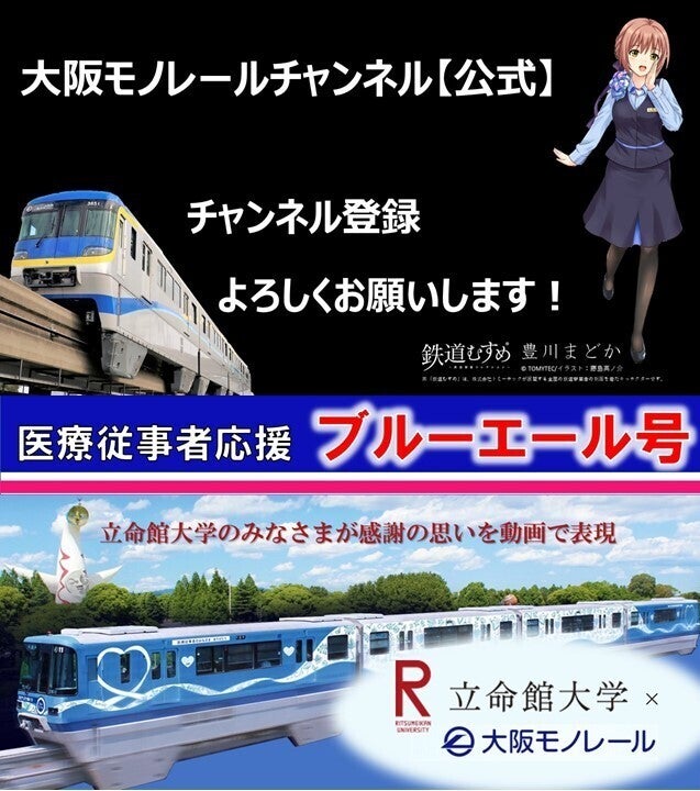(動画URL:https://youtu.be/WhmlkRm3omA)大阪モノレールは、4月30日にYouTubeで「大阪モノレールチャンネル【公式】」を開設し、動画配信を始めております。(チャンネルURL:https://www.youtube.com/channel/UCiQXfGy9HjavaZhGU-036EA)本日5月26日は、ブルーエール号車内で放送している立命館大学のみなさまが作成した動画を配信いたしました。動画内では立命館大学各キャンパスの学生さんが、医療従事者の方々へのメッセージを伝えております。明日5月27日も第2弾を配信予定です。ぜひチャンネル登録のうえ、ご覧ください!