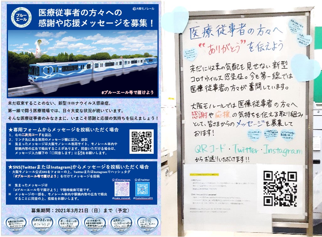 大阪モノレールでは、2020年12月15日から2021年3月21日まで、医療従事者の方々への感謝や応援メッセージを募集しております。すでにメッセージを投稿いただいたみなさま、誠にありがとうございます。大阪モノレールは、より多くのメッセージを医療従事者の方々にお届けしたいと考えております。引き続き、みなさまのメッセージを心からお待ちしております。※各駅掲示板でのメッセージ募集(2021年1月25~29日掲出)★メッセージの投稿方法は以下の2種類です。①専用フォーム上のQRコードを読み込み、専用のメッセージ欄に記入し送信してください。専用フォームはこちらからもアクセス可能です。※お寄せいただいたメッセージは、大阪モノレール専用サイト、モノレール車内や駅構内等の広告で掲出することがあります。ご同意いただける場合は、メッセージ入力欄下の「□同意します」に☑をお願いします。②SNS(TwitterまたはInstagram)大阪モノレール公式SNS(TwitterまたはInstagram)をフォローの上、ハッシュタグ「#ブルーエール号で届けよう」を付けてメッセージを投稿してください。※お寄せいただいたメッセージの一部を、モノレール車内や駅構内等の広告で掲出することにご同意の上、投稿をお願いします。※Twitter、Instagramのアカウントを「非公開」に設定されている場合は、メッセージをいただくことができませんのでご了承ください。