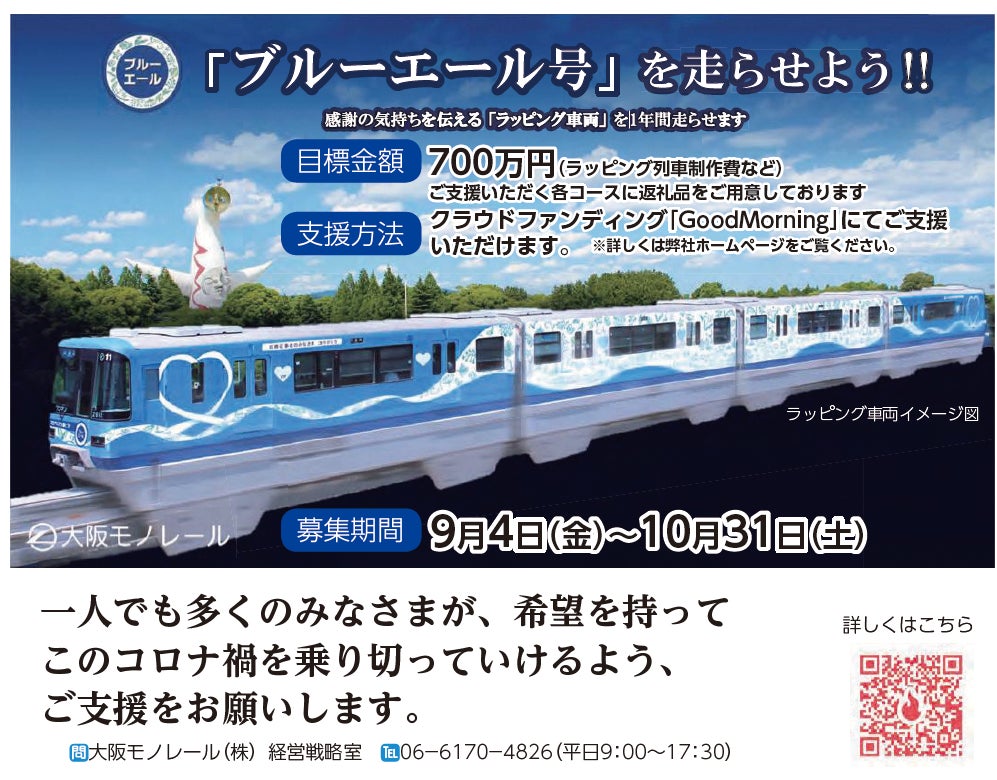 全国のみなさまのご賛同により、300人を超える方にご支援いただきました。既にご支援いただいたみなさまに、厚く御礼申し上げます。また、沿線各市さま、各報道機関さまなど、このプロジェクトは様々な媒体でご紹介をいただいております。重ねて御礼申し上げます。みなさまのご支援により、このプロジェクトは折り返し地点を迎えました。目標達成のためには、さらなるご支援・ご協力が必要です。医療従事者の方々へ感謝と応援メッセージを届けられるよう、引き続き全力で取り組んでまいります。今後ともお力添えのほどよろしくお願い申し上げます。大阪モノレール株式会社代表取締役社長 井出 仁雄