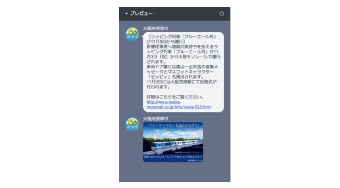 摂津市公式LINEに、「ブルーエール号」プロジェクトの内容を投稿いただきました。車体側面ドア横には摂津市長の直筆メッセージとマスコットキャラクター「セッピィ」を掲出する旨を紹介いただきました。全国からのご支援や、沿線地域のみなさまのご協力で、プロジェクトは一歩ずつ前に進んでいます。本当にありがとうございます!