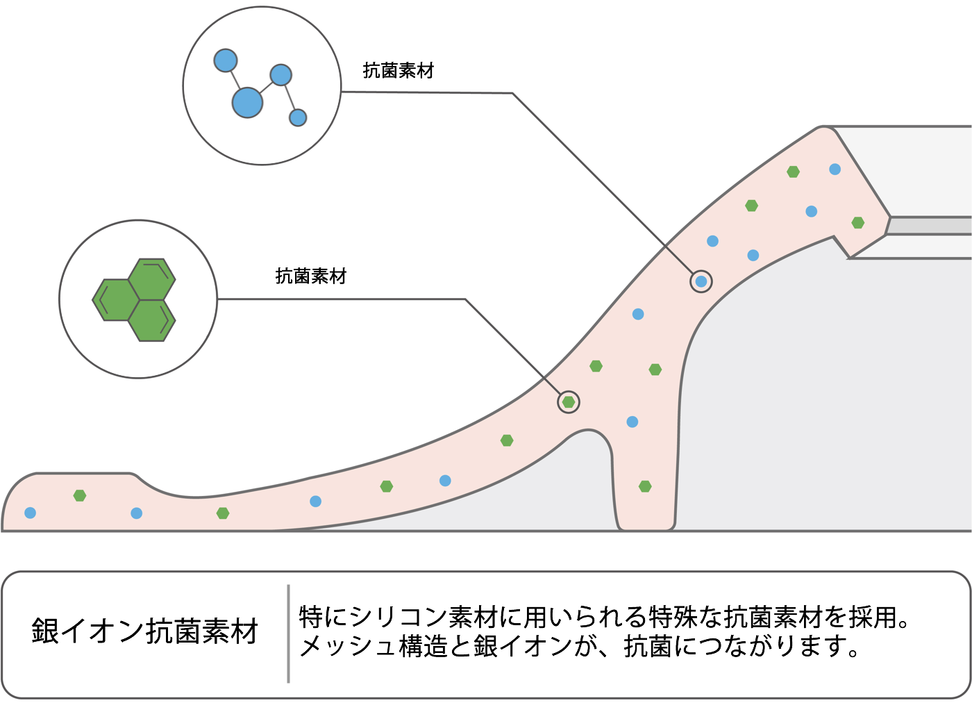 素材に配合された銀イオン粒子の抗菌により、お風呂などより清潔に快適な状況を保つことができます。