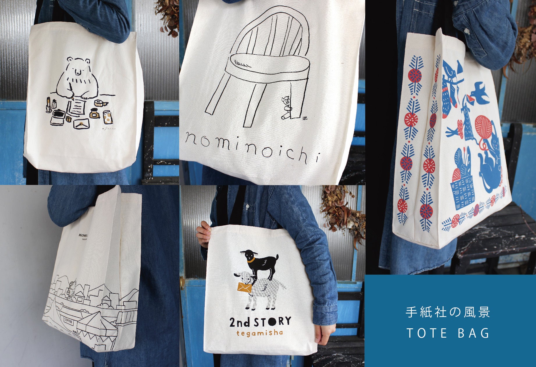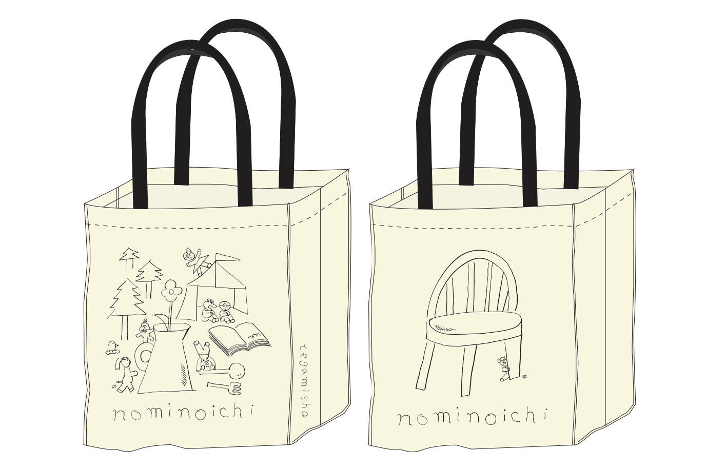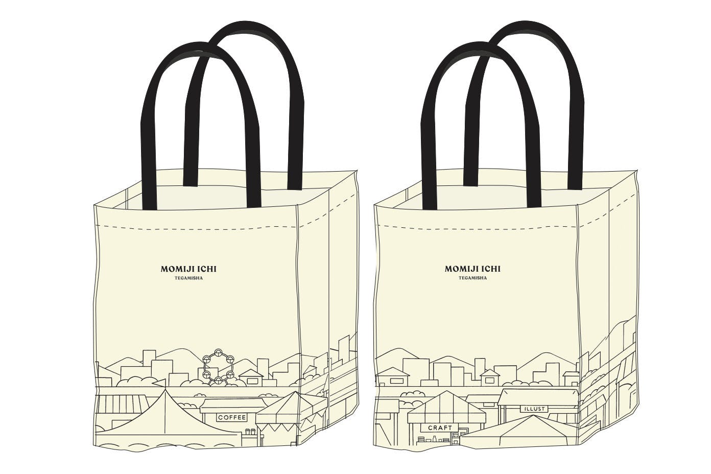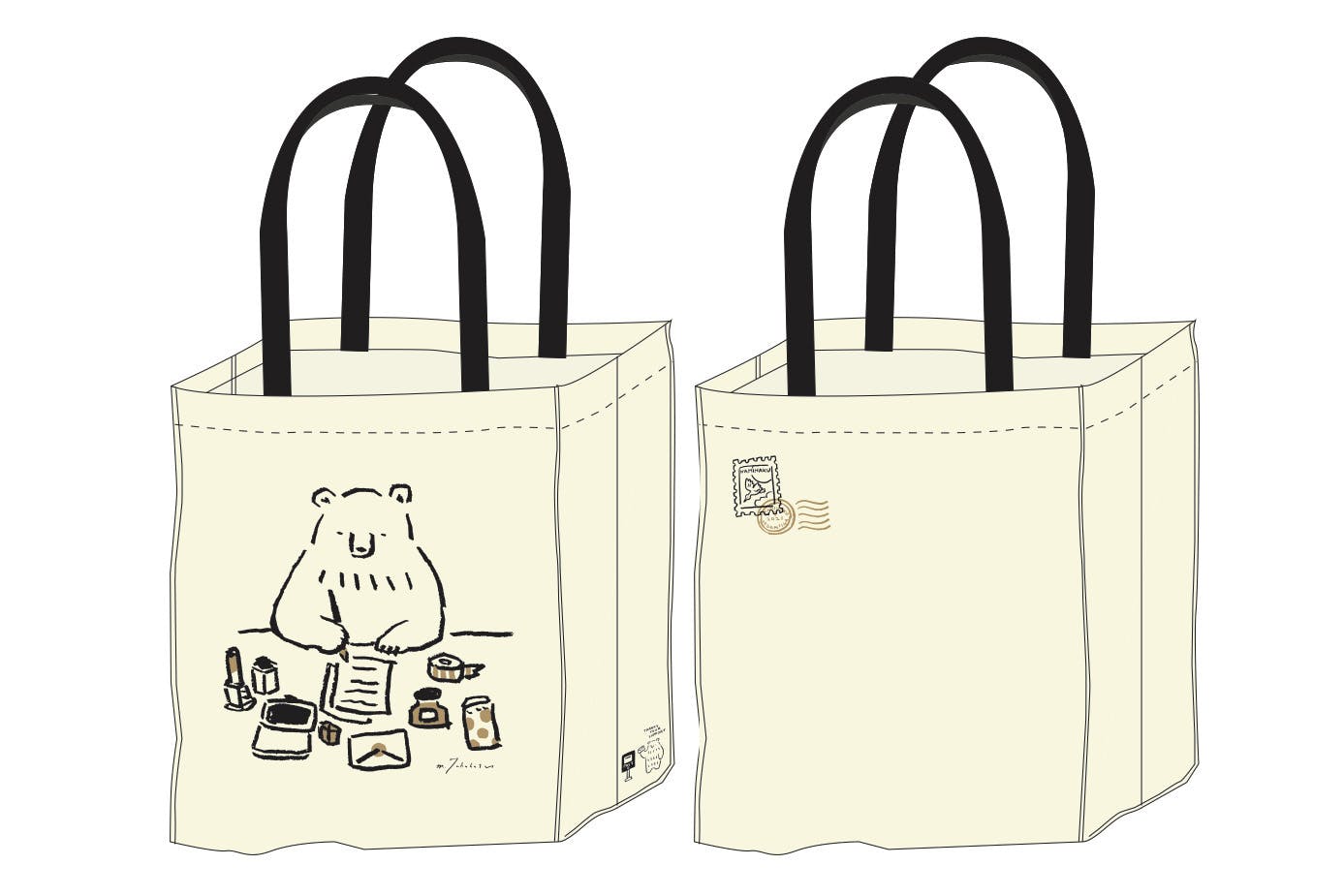 2020/12/06 18:5411/11にスタートした手紙社初のクラウドファンディングも、残り16日となりました。「もみじ市」「蚤の市」「紙博」「布博」など、今まで開催してきたリアルイベントに参加してくださった方、一度行ってみたいと思ってくださっていた方、さらにはイベントに出展くださっていた関係者の皆さまなど、たくさんの方々からのご支援をいただきまして本当にありがとうございます。お寄せいただいたコメントもすべて拝読し、日々勇気付けられている手紙社スタッフです。誰もが大変な時期にもかかわらず、温かく応援くださっておりますこと、重ねて心より感謝申し上げます。そしてつい先日、今回のクラウドファンディングのために制作しましたリターンの一つ、<【雑貨で支援】「手紙社の風景」トートバッグ>のサンプルが届きました! 手紙社にゆかりの深い作家さんに書き下ろしていただいた5種類のトートバッグ。バッグの形は今回のために作ったオリジナル。持つ手は黒で、形は角にステッチを入れ紙袋のようなフォルムに。今後再開できた暁には(!)イベント会場で入手したお宝もたっぷりと入れられる大きめサイズで、持つ手は男性が肩からかけても余裕のある長さにしました。デザインは「手紙社の風景」と題し、手紙社の5つのイベント・店舗をテーマに。それでは早速、届いたサンプルの写真とともに紹介して参ります!「もみじ市の風景 トートバッグ」デザイン:YUNOSUKE天候に悩まされることも多いけれど、やはり思い出すのは、広い多摩川の河川敷にひしめくテント。そんな風景をYUNOSUKEさんにお願いしました。「清々しいもみじ市の風景を、4面1周続くように、シャープでシンプルにデザインしてみました!」by YUNOSUKEさん(表面:多摩川河川敷から見える観覧車も!)(裏面:陶芸家さんやイラストレーターさんなど、様々なジャンルの方々が集まる「もみじ市」の風景です)そしてなんといってもこのトートのポイントは、ぐるり1周、4面のイラストがつながっている点! 広大な多摩川の河川敷にひしめくテントが思い起こされるデザインです。----------------------------------------------「蚤の市の風景トートバッグ」デザイン:ニシワキタダシ日本各地で過去24回開催してきた「蚤の市」で、何度もメインビジュアルを担当いただいたニシワキタダシさんによるデザインです。「テントやアンティークな花瓶、本、食器などを今まで蚤の市で描いてきたキャラクターたちと合わせて、会場の雰囲気が伝わるように描いてみました。このバッグを持って蚤の市に来てくれるとうれしいなと思います」by ニシワキさん(表面:蚤の市のメインビジュアルとしても活躍してくれているキャラクターが大集合!)(ニシワキさんによる、味ある「tegamisha」の文字が側面に!)(裏面:古道具の椅子からひょこっと現れる"おじさん"!)----------------------------------------------「布博の風景トートバッグ」デザイン:kata kata2013年の「布博」初回開催より参加の型染め作家・kata kataさん。記念すべき初海外、2018年「布博 in 台湾」の際にもメインビジュアルを担当いただき、台湾のお客様に大好評でした。「サイドは刺繍のステッチをイメージし、前面・後面は布博にまつわるモチーフを配置しました。編み物をテーマにした面には、手紙を咥えた鳥を飛ばしました」by kata kataさん(表面:ややスモーキーな青と鮮やかな赤がパッと目を引くカラーリング)(裏面:生地、糸、針、型紙、ハサミ…布博の楽しさが伝わってきます!)(刺繍をモチーフとしたデザインが施された側面がポイント)----------------------------------------------「紙博の風景トートバッグ」デザイン:高旗将雄2017年の「紙博」初回開催より、参加くださっている高旗将雄さん。開場と同時に、いつもブースには人だかりが絶えません。「クラウドファンディングということで、その支援に御礼の手紙を書いて届ける、というような感じで制作しました」by 高旗さん(表面:高旗さんが描くモチーフの中でも人気のクマが、手紙をしたためて・・・)(裏面:切手を貼って・・・)(支援くださった皆様へ感謝を込めてポストへ投函!)----------------------------------------------「手紙舎 2nd STORYの風景トートバッグ」デザイン:升ノ内朝子2013年にオープンした手紙社が運営するカフェ&雑貨店「手紙舎 2nd STORY」。カフェで人気の「オテフキ」をデザインくださった升ノ内朝子さんにお願いしました。「2階をテーマに、オテフキにも登場するヤギを描きました。差し色はミルクコーヒー色です」by升ノ内さん(表面:実際、階段を上がったところに入り口がある「手紙舎2nd STORY」とリンクするようなイラストを描いていただきました!)(裏面:"2階"をテーマにしたバッグの裏面は、白ヤギ、黒ヤギの2段タワー!)(側面には、かじられてしまった手紙。かじったのは白ヤギさん? 黒ヤギさん?)(扉に入っていく可愛いお尻も)----------------------------------------------そんな想いの詰まった5種類のトートバッグを、イベントが再開できるその日を願いながらお使い