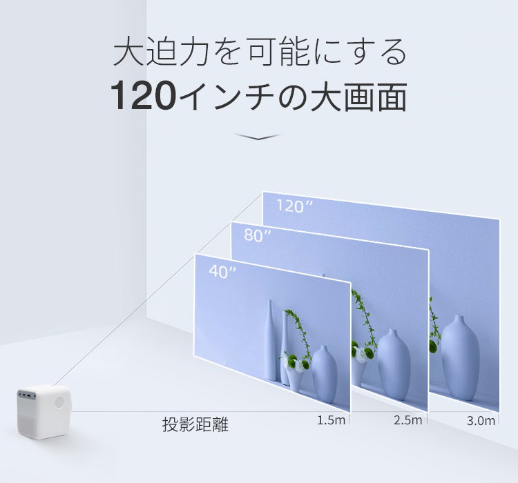 「CUBEE」が映し出すのは、お家のTVの何倍もの大きさの大迫力映像です!ご家庭での使用で十分満足頂ける1.5m~9m、40~120インチに対応しています。