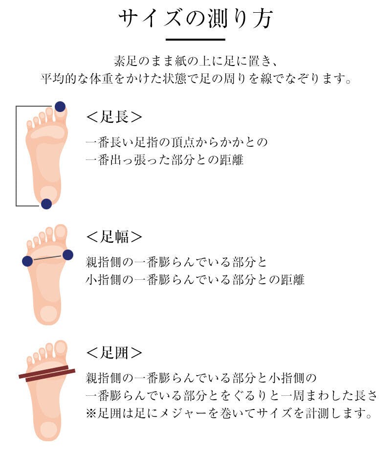 ※ 足長、足幅、足囲の3点の採寸ポイントで優先順位を迷われた場合は、「足幅」のサイズを優先的にご検討下さい。