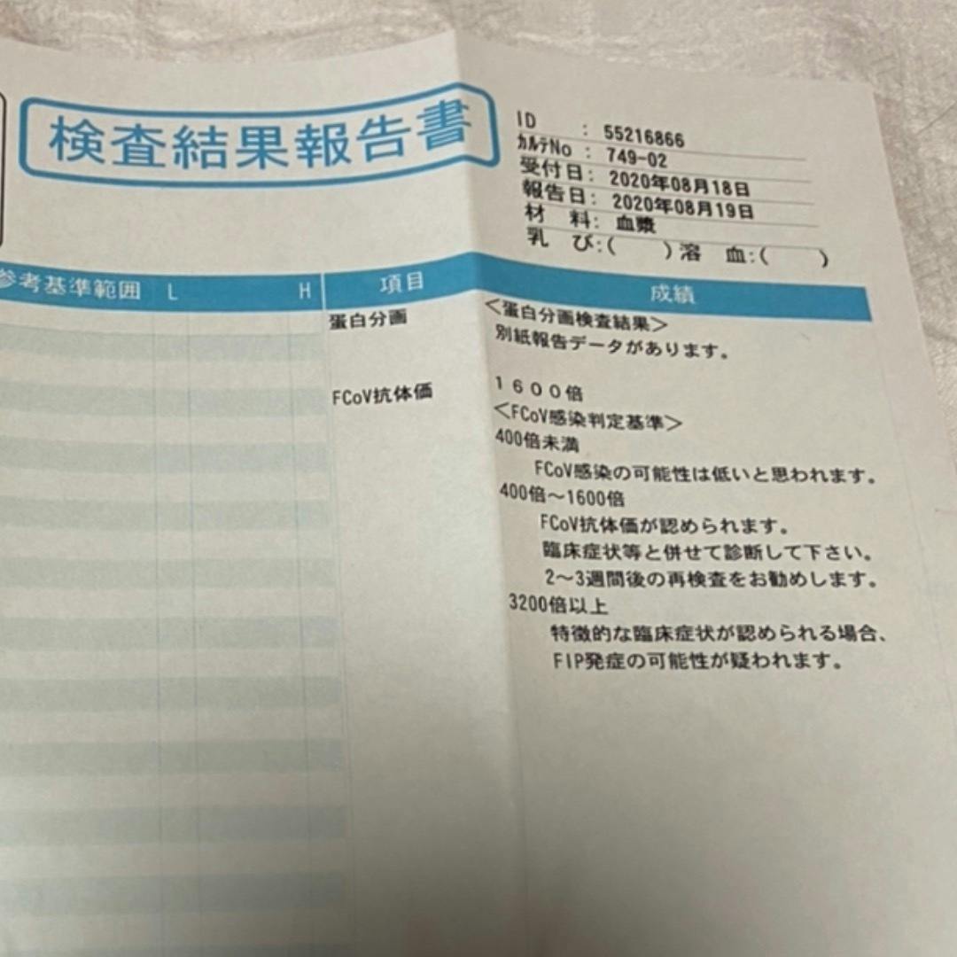 SAAという値が高く炎症がひどい状態で、先日病院から電話がかかってきて、検査結果を聞きました。猫伝染性腹膜炎で間違いないそうです。その後の検査結果は以下の通りです。