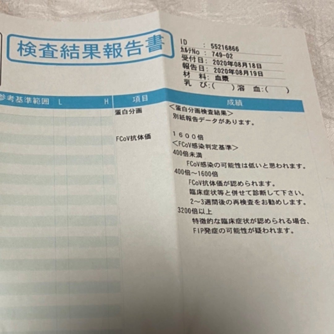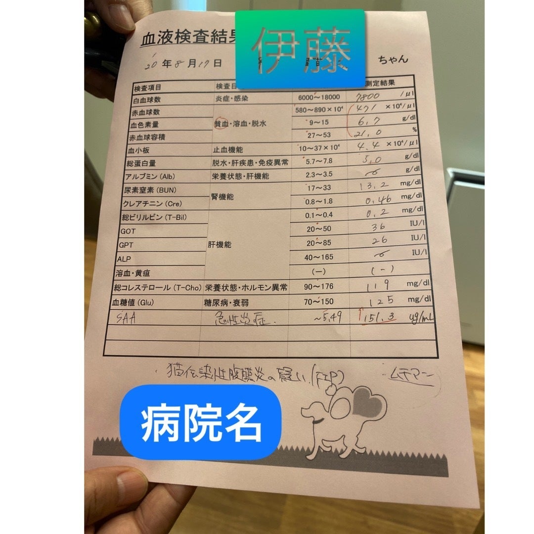 SAAという値が高く炎症がひどい状態で、先日病院から電話がかかってきて、検査結果を聞きました。猫伝染性腹膜炎で間違いないそうです。その後の検査結果は以下の通りです。