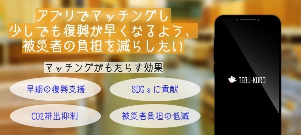 現在、弊社は「TEBU-KURO」というアプリを運営しており、そのアプリ独自の機能で「リクエスト機能」を設けております。「リクエスト機能」とは出品者からの一方通行ではなく、購入希望者側が必要としている物や事を「リクエスト」できる機能です。その機能を使って、被災された方が、実際に必要としている物、本当に何が必要なのかをリクエストできるようすることにより、それを見た企業の方やボランティア、行政等の方が、物資を直接供給したり、高齢の方や人手が足らないときはボランティアの方や業者の方にリクエストする事で、少しでも早い復興に役立てるようにし、被災された方の負担を少しでも減らせるようにしていきたいです。