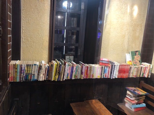 2002年夏に開店しました。夜に開き、コーヒー・チャイなどのノンアルコールでも、ビール・カクテルなどのアルコールでも、どちらの利用でも過ごしやすいお店を目指して始まりました。閲覧用蔵書500冊程度。また、出版社の営業代行の仕事の関係で、青林工藝舎(旧「ガロ」の流れを汲む出版社)の雑誌「アックス」で活躍されている漫画家さんなどにトーク・ライブなどをお願いするようになり、今まで続いてきました。