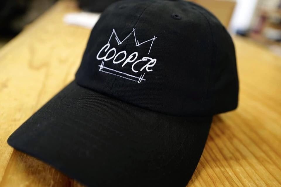 スタッフ用に作成ました、COOPERのロゴを刺繍した帽子をリターン品でご用意しました。