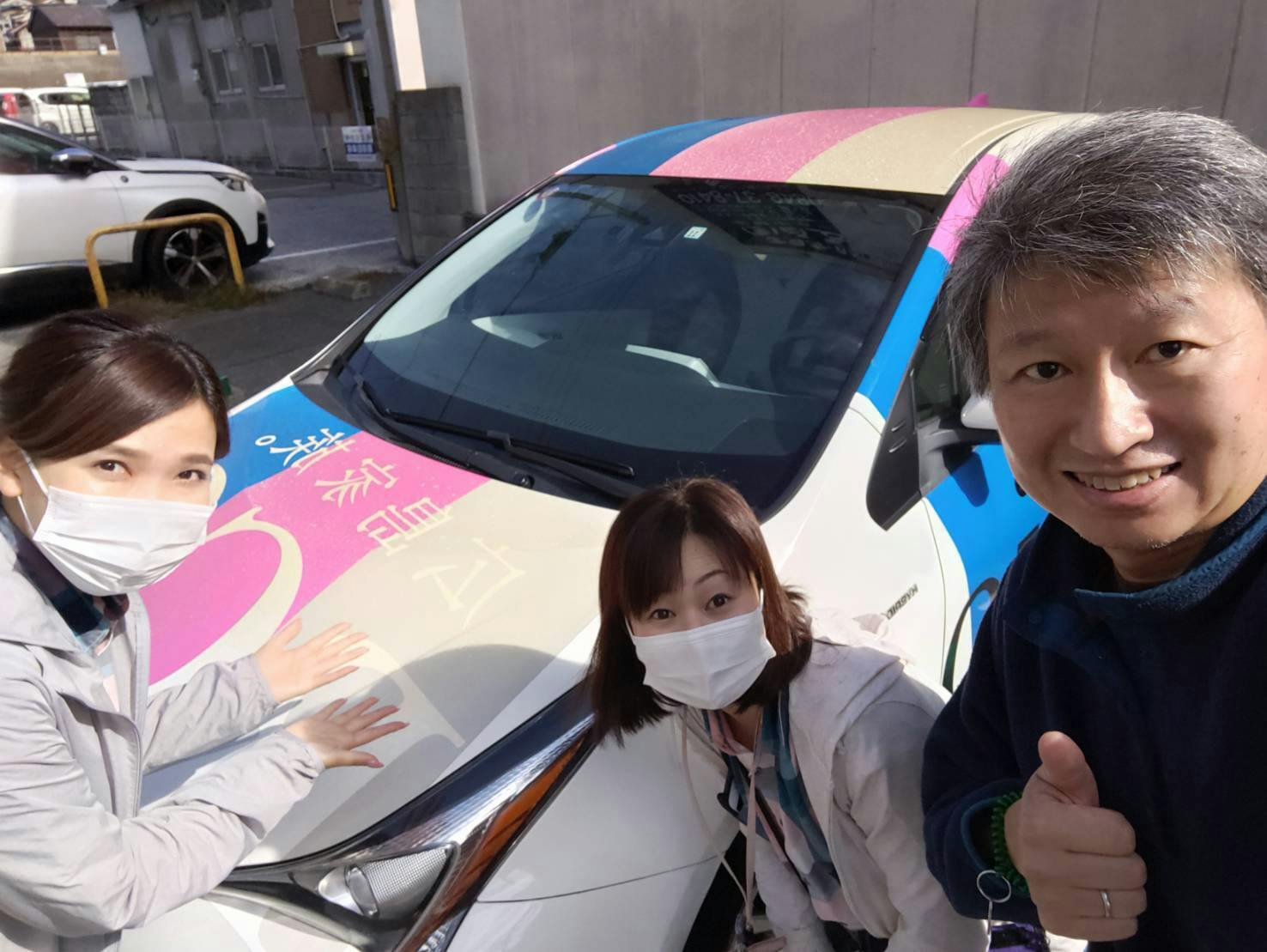 ラジオカーが尾道新開ゲストハウスSINGAI CABINの前に到着して写真をパチリ!