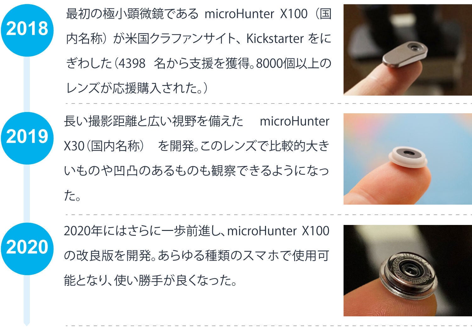 長年の努力により、2018 年に開発した極小顕微鏡 「microHunter X100」は、モバイル顕微鏡の常識を打ち破るものでした。卓上顕微鏡にも匹敵する光学性能を備えており、財布に入るほどコンパクト。旧型の優れた光学性能と携帯性に加えて、新型のmicroHunter X100 はより洗練されたデザインとなり、また、あらゆるスマートフォンに対応しました。