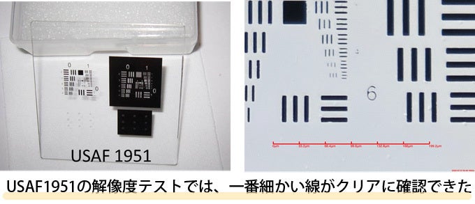USAF1951解像度テストチャート( 最小テストバーの間隔は2.19㎛ )を使用して、iPhone11でmicroHunter X100 の解像度を検証したところ、ご覧の通り、最小テストバーが余裕ではっきりと確認できます。