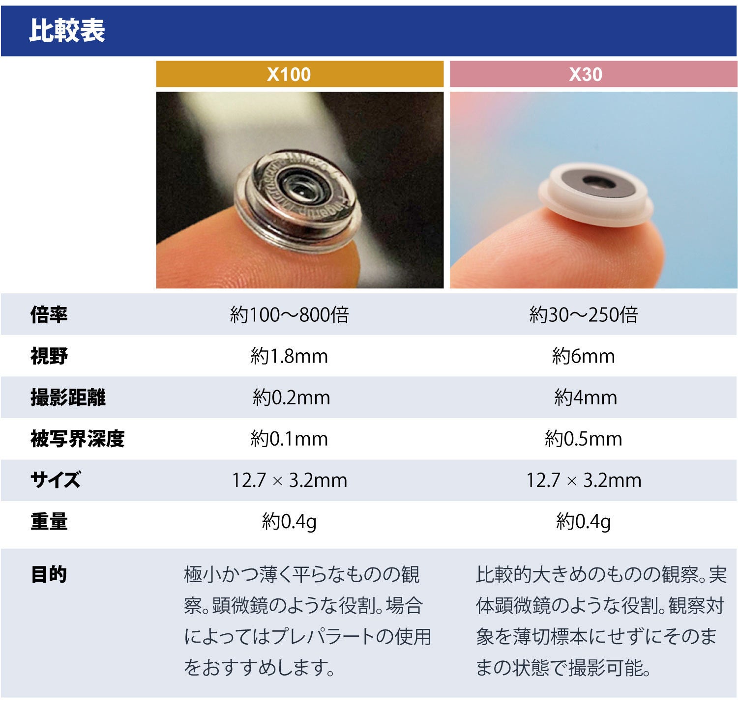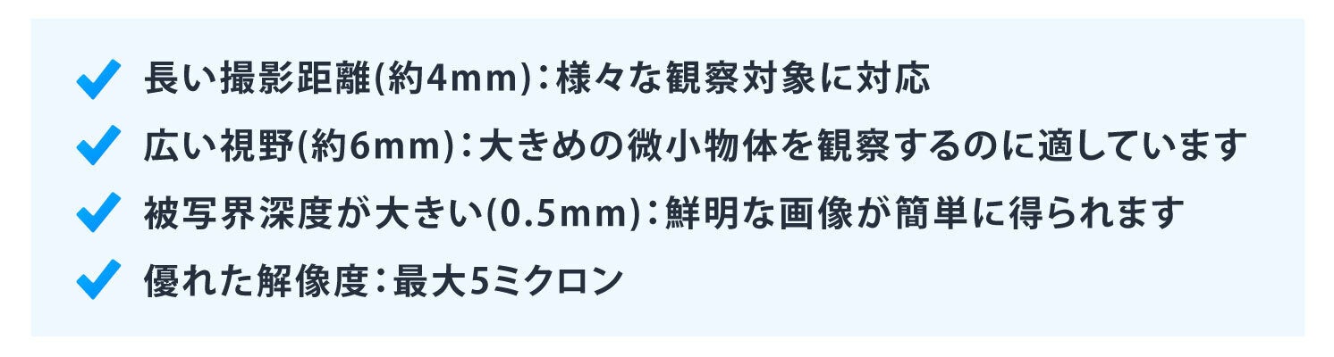 この光学性能試験からわかる通り、microHunter X100 は卓上顕微鏡に匹敵する優れた光学性能を備えています。