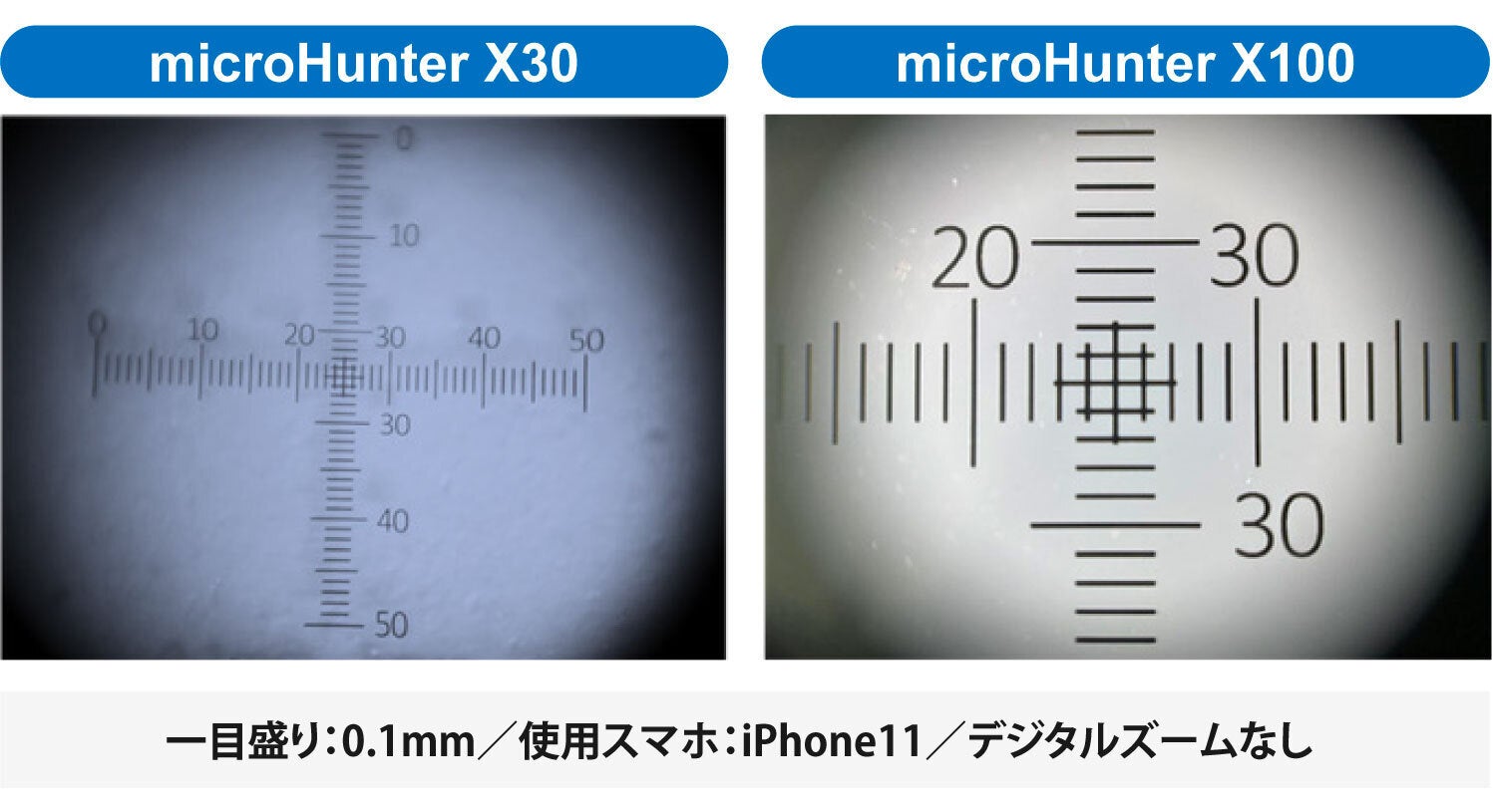 上画像は、microHunter X30 とmicroHunter X100で撮影した全く同一のスケールターゲットです(デジタルズームは不使用)。それぞれ視野が全く違う事がわかります。 microHunter X30は倍率が低く、視野が広いのに対し、microHunter X100は倍率が高く視野が狭くなっています。そのため、撮影したい対象物によってこれらのレンズを使い分けることができます。