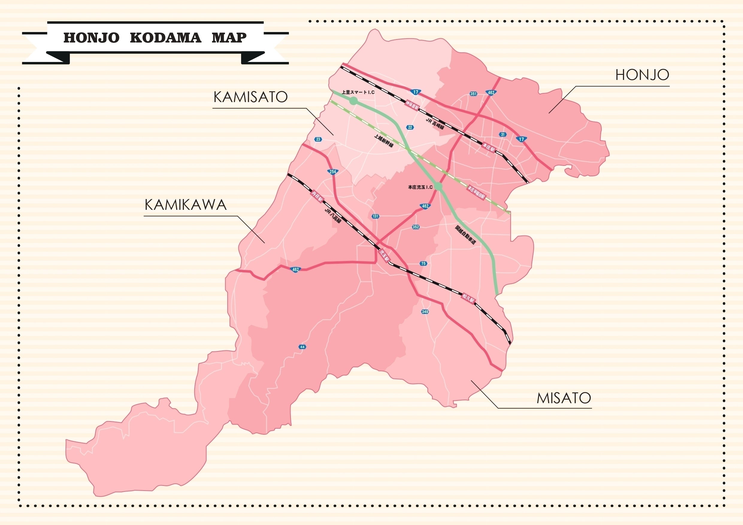 我々の活動するエリア、埼玉県北西部は自然豊かなまちではありますが、都心へのアクセスも良く隣接する群馬県への交通網も充実し、大変暮らしやすい街です。本庄市・美里町・神川町・上里町の1市3町からなるこだま郡は、発展するまちの中でも古き良き町並みが残り、また自然も多く存在しながらも主要道路や在来線、新幹線など交通網を網羅しアクセスの大変良い地域です。