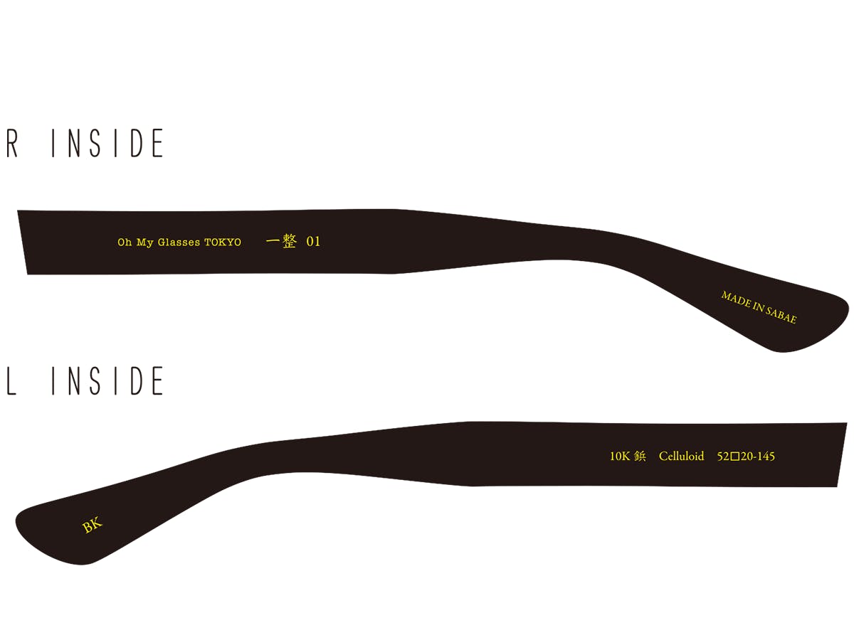 テンプル(つる)の内側へ印刷、ブランド名の印字内容です。