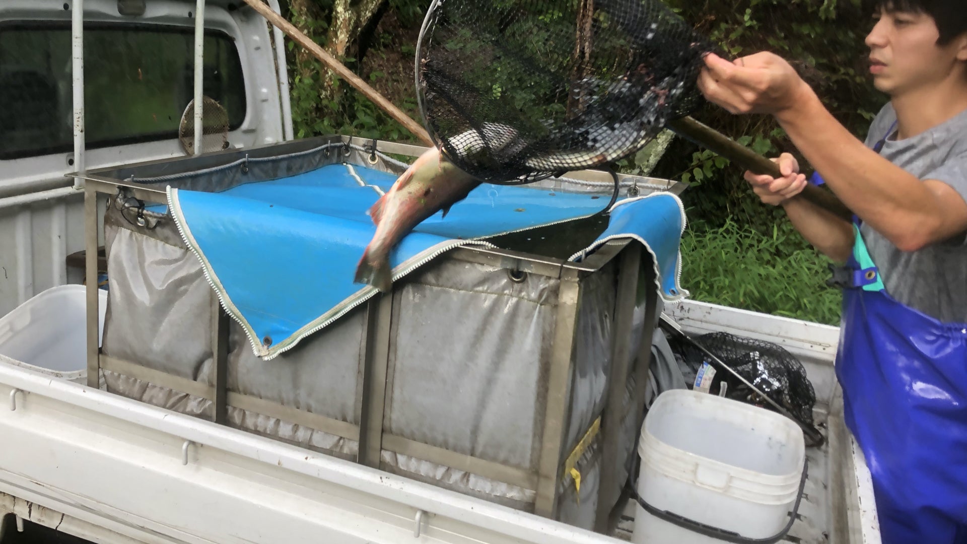 その中でも、特にわれわれが力を入れているのが、海面養殖を経て川に戻すメソッドによって生まれる巨大なニジマスです。