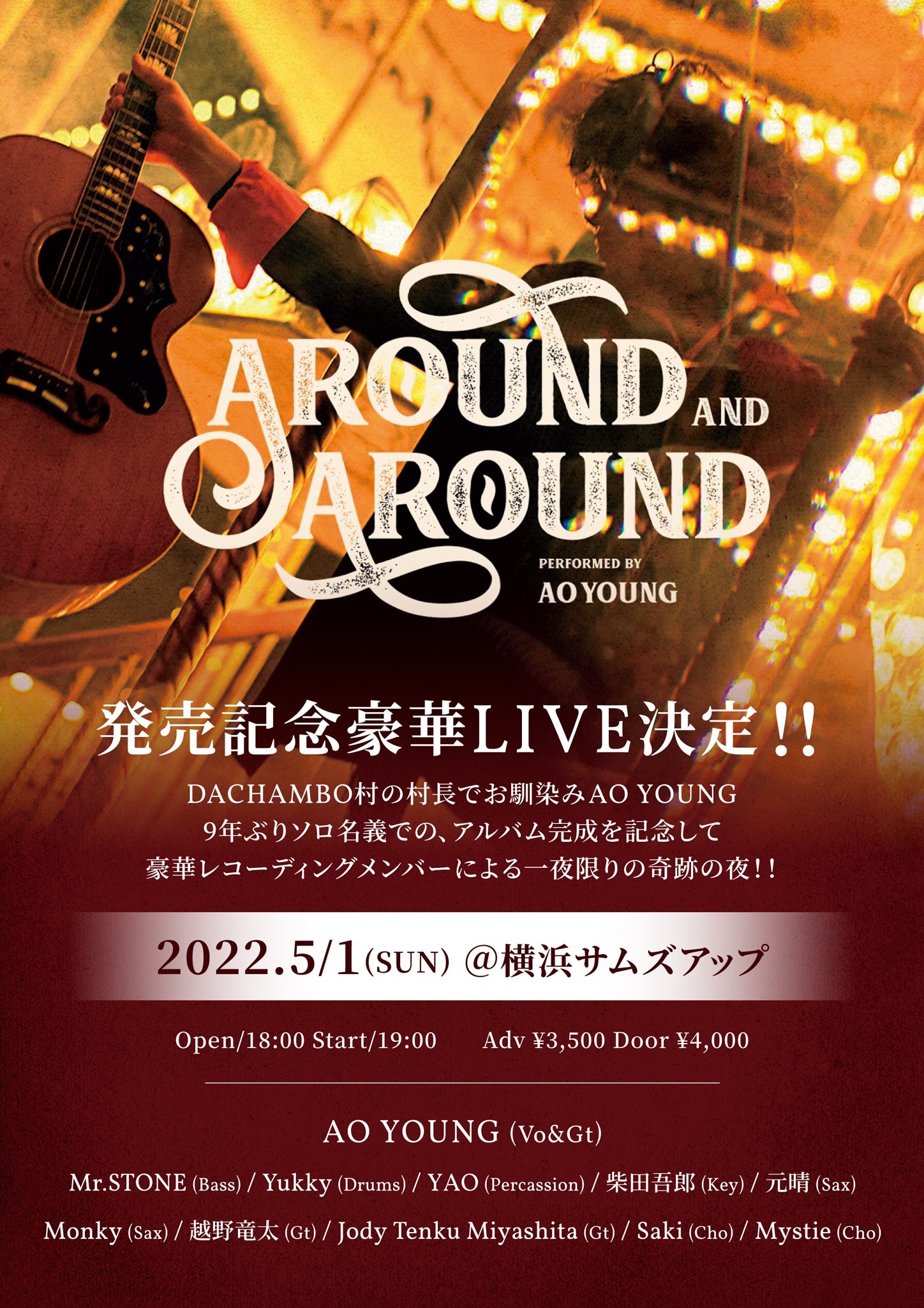 2022/04/25 22:30ご無沙汰しております!プロジェクトオーナーのAO YOUNGです。ご支援いただいて完成したアルバム「Around And Around」の完成記念ライブが迫ってまいりました〜♪こちらでのご報告が遅くなってしまって大変申し訳ないです。。総勢11名の豪華ビッグバンドでアルバムの名曲が蘇ります!更にカバー曲も用意して、R&Rファンタジーなショウを予定してます。友達みんな誘って遊びに来てくださーい!!!愛の拡散口コミ御協力もぜひともお願いします!★5 / 1 (日)横浜サムズアップAO YOUNG「Around and Around」発売記念豪華ライブ!Open/18:00 Start/19:00Adv ¥3500 Door ¥4000メンバーAO YOUNG (Vo&Gt )Mr.STONE (Bass)Yukky (Drums)YAO (Percassion)柴田吾郎 (Key)元晴 (Sax)Monky (Sax)越野竜太 (Gt)Jody Tenku Miyashita (Gt)Saki (Cho)Mystie (Cho)Guest DJ Moc (Jazzy Sport / Powers)チケット予約サムズアップ045-314-8705 もっと見る