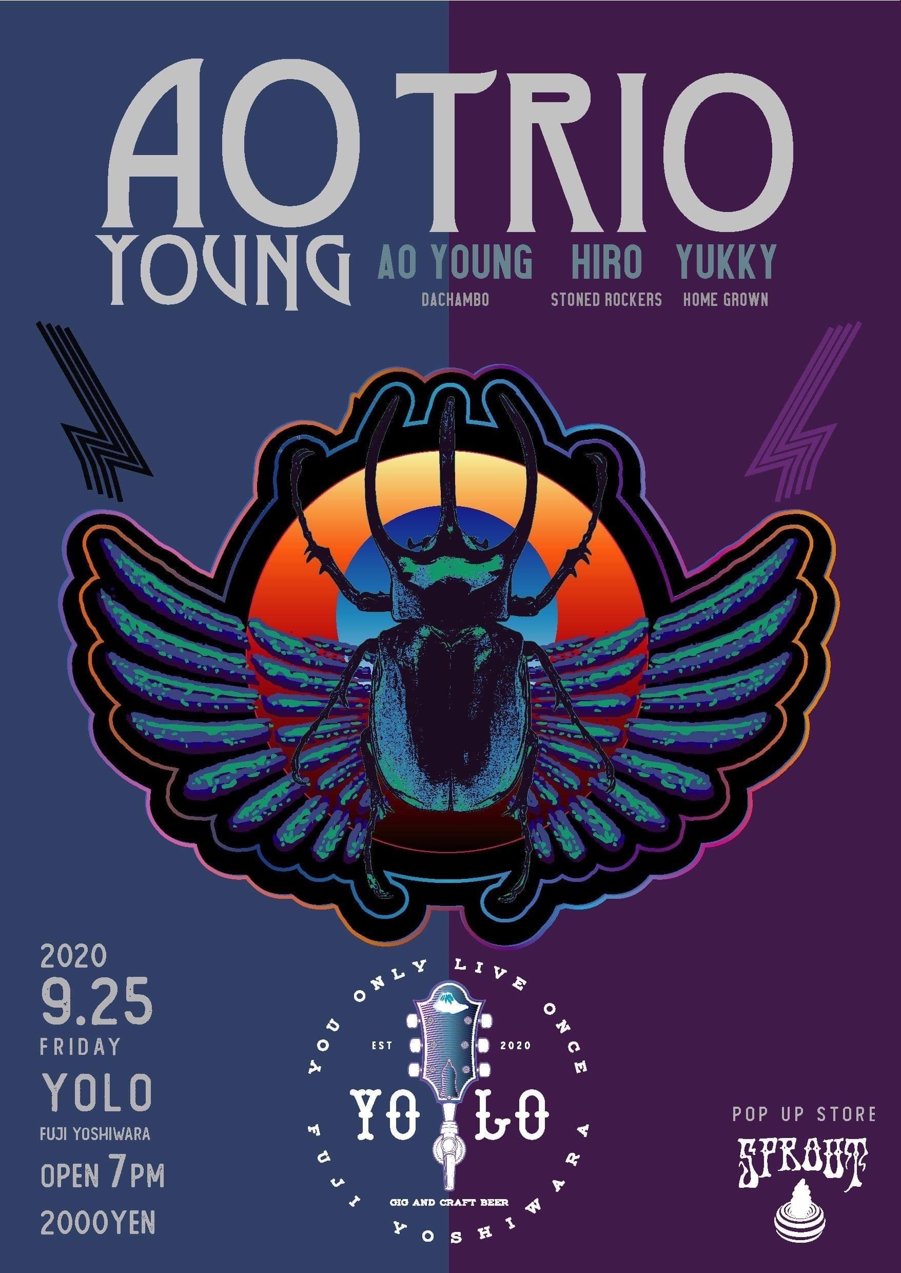 本日より静岡〜愛知でLiveあります!お近くの方は是非遊びにきてください。そしてクラウドファンディングも開始から1週間!今のところまだ30%っす。。ツアー中だとなかなかパソコンも開けず、、皆さまの協力が必要です!どうか応援口コミ拡散愛をくださいっ!!https://camp-fire.jp/projects/view/319653〜AO YOUNG TRIO〜AO YOUNG Vo&Guitar (from DACHAMBO)HIROHISA Mr.Stone Bass (from STONED ROCKERS)YUKKY Drums (from HOMEGROWN、TOMBI)★9.25fri 富士市吉原Live Bar YOLOOpen/19:00 Start/20:00Charge ¥2,000limit40名★9.26sat 豊橋市岩田運動公園Sports Park Fee ビアガーデン11:00〜入場無料W/ALKDO , sozoro座mode他