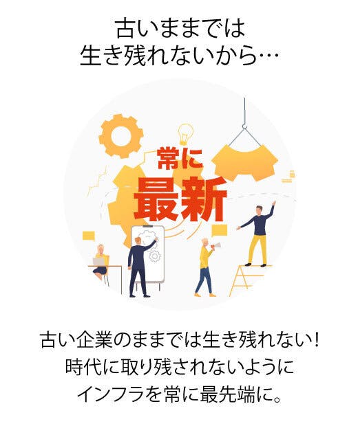 もう決断疲れすることなく、最先端のインフラとオンライン化が実施されます。つまり、あなたの会社が自動で生まれ変わります。常に最新の環境がインストールされ続け、先進テクノロジーを取り入れた経営にアップデートされます。