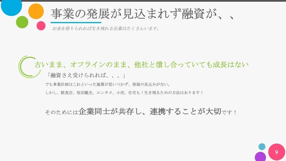 貸付を申し込んだけど断られてしまった企業の方も、私たちのサービスを使って再生を図る事業計画を提出すれば、多くの企業がお金を借りることができ、生き残れるのではと感じています。
