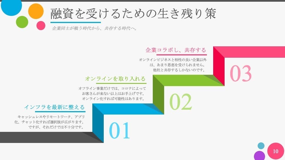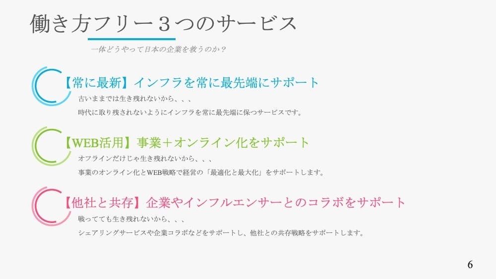 それで、生き残れる可能性が高まります。「働き方フリー」を取り入れた企業は、一度は融資を断られた法人様や自営業者様でも救うことができると感じております!