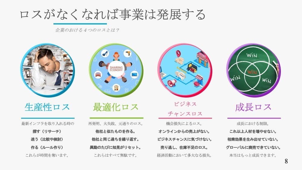 大体どの企業も同じ感じの似通ったインフラになるのに、似たようなものを自社で再開発しているロスはあまりにも大きい。WIN-WINの連鎖で、WIN-WIN-WINになるビジネスアイデアを生み出し、新しい価値でビジネスを最大化することに挑戦してみませんか?