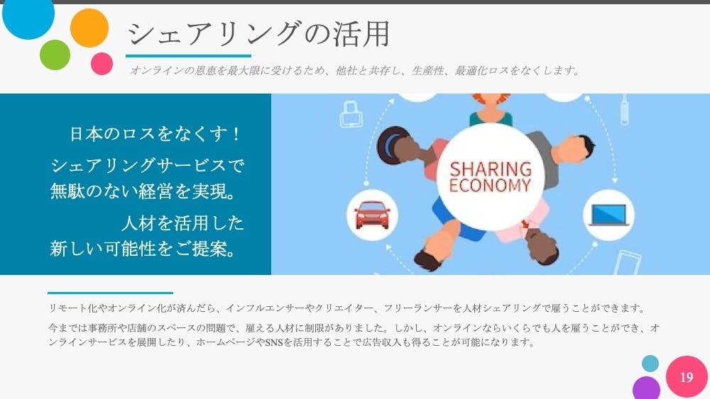 - 事業のオンライン化/無駄のない経営/シェアリングの活用/外注化コンサル